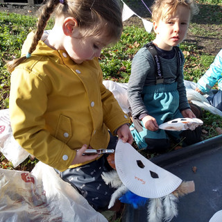 To make our woodland superhero costumes we started by looking for some large sycamore leaves that had fallen to the ground. We collected the leaves and tied two of them together using small sticks and some colourful wool. This made our wings. We then used scissors to cut some paper plates in half for our masks. We cut out eyelets and then decorated our masks using leaves, feathers and anything else we could find. We used a hole punch to make two holes on either side of our masks and threaded some wool through the holes so we could fasten them to our heads. Our costumes were now complete and we could get on with our task of keeping the woodland in prime condition for all to enjoy!