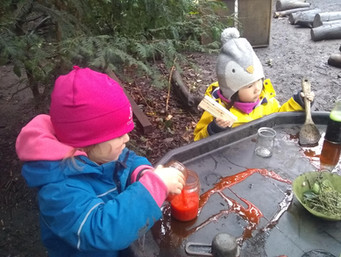 Main Activity: Our main activity this week was making magical potions! To start we gave the children a glass jar to mix their potions in (unfortunately we were running low on cauldrons this week). We then went on a scavenger hunt inside and outside the nursery to find our ingredients. These included discarded flowers, woodchip, leaves, shells, twigs and ferns. Once all the ingredients had been gathered it was time to mix the potions. We set out all the items on a tuff tray along with our special ingredient - water mixed with colourful food dyes. The children put their items into their jars and added the food dye mix (some children decided not to add the food dye). The potions needed a lid so we gave the children some squares of material, covered them over the jar lids and the children helped to tie some garden string around the lids to keep their potions safe.